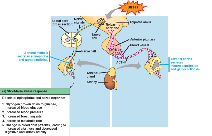 The adrenal medulla mediates short-term responses to stress by secreting epinephrine (adrenaline) and norepinephrine (noradrenaline).